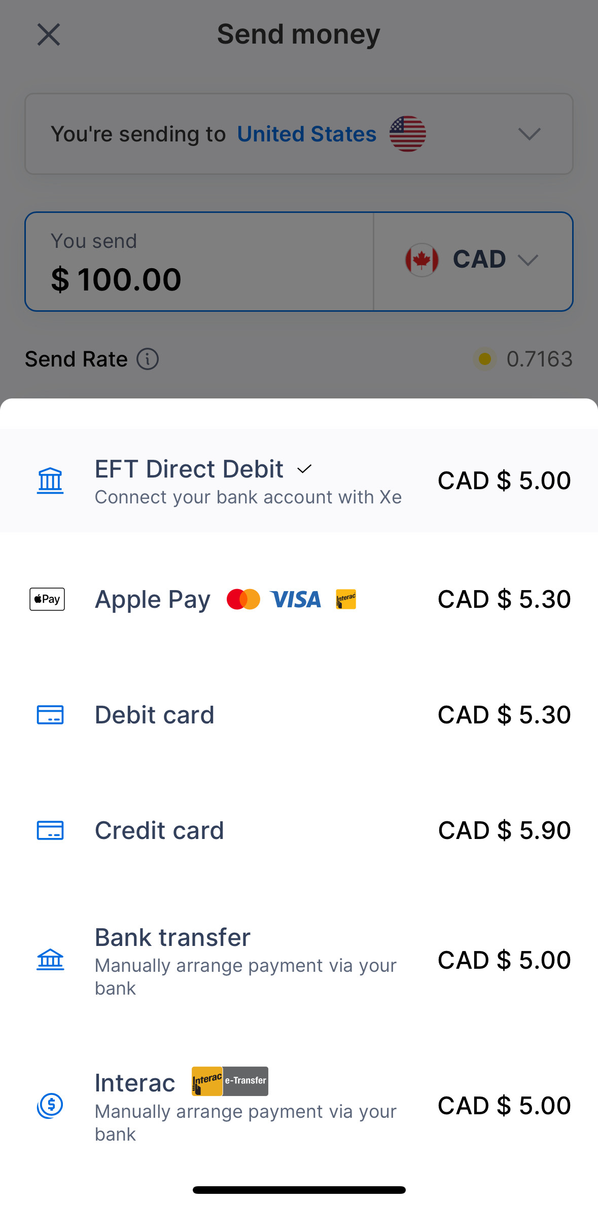 - Select your payment method. Choose debit, credit, bank transfer, Interac, Google Pay or EFT direct deposit to fund your transfer.