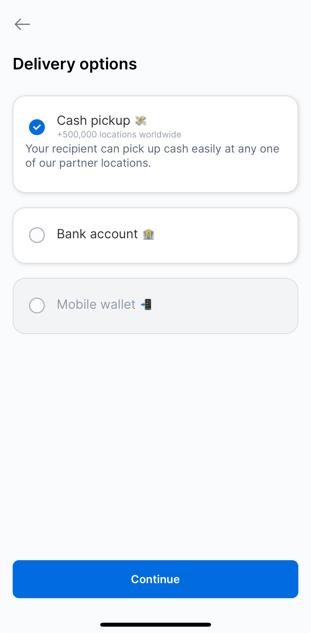 | Receiving Options | Cash pickup location, Bank account, Mobile wallet |
