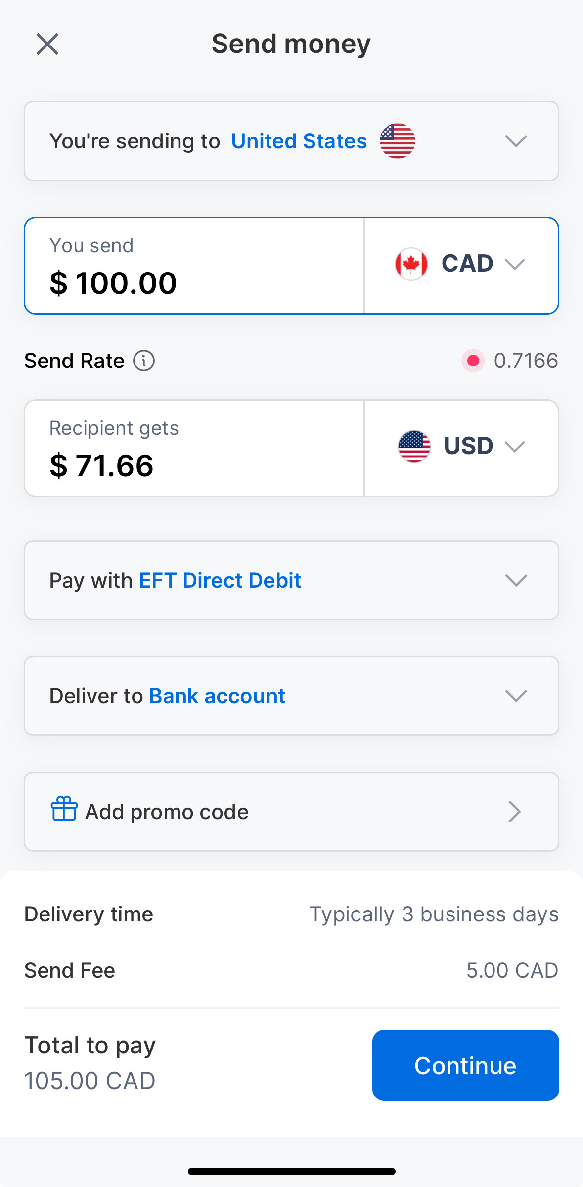 For example, if you want to send $100 to the United States, this is what your fees will look like: