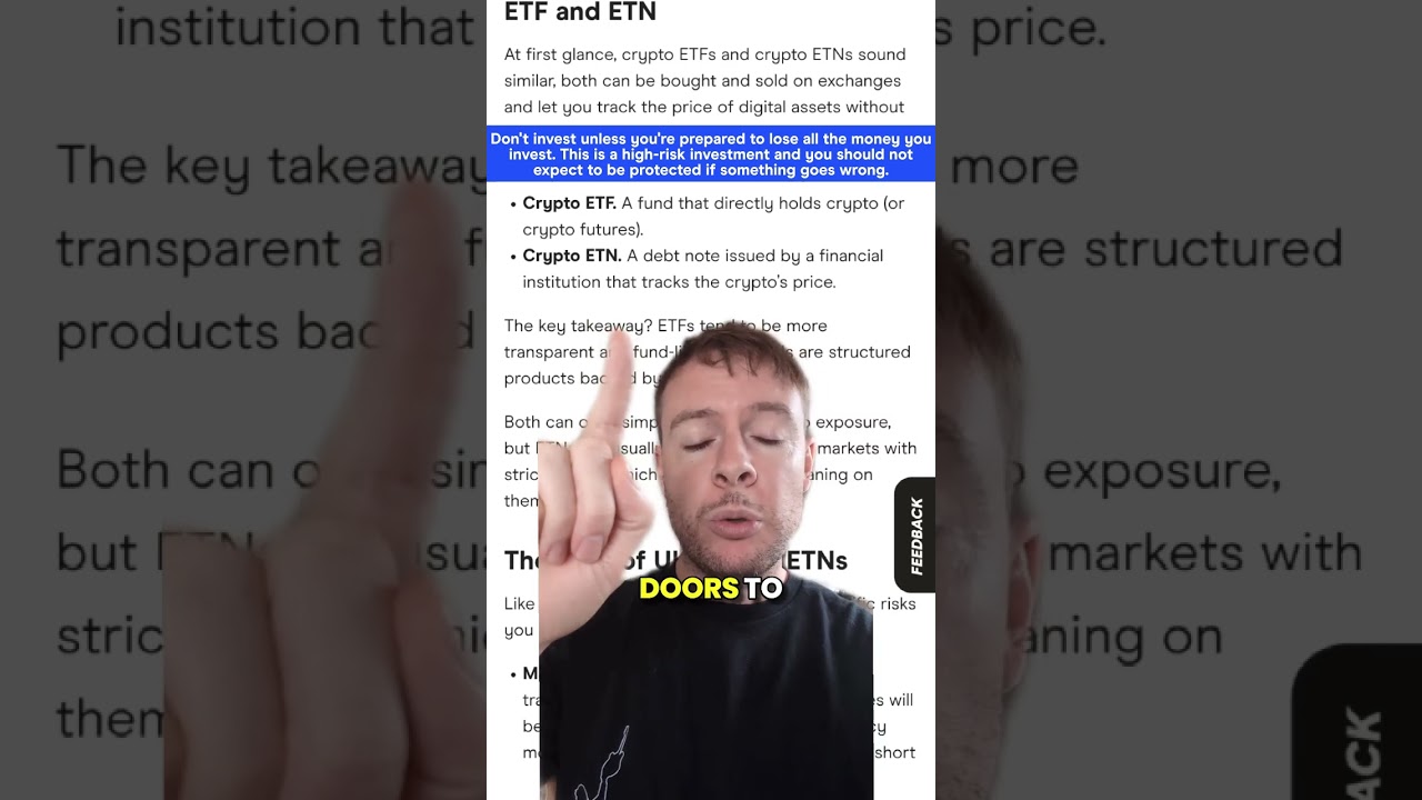 At first glance, crypto ETFs and crypto ETNs sound similar, both can be bought and sold on exchanges and let you track the price of digital assets without holding the coins yourself, but the structure is different: